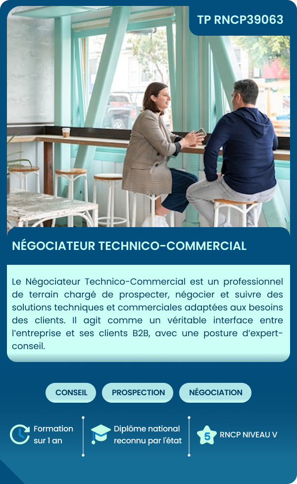 Dans le respect de la politique commerciale de l’entreprise et des objectifs fixés par la hiérarchie, le négociateur technico-commercial élabore une stratégie de prospection. Il organise et met en œuvre un plan d’actions commerciales et en évalue les résultats. Il conçoit des propositions techniques et commerciales personnalisées et les négocie avec les interlocuteurs de l’entreprise prospect ou cliente. Il assure leur suivi afin d’optimiser la satisfaction de l’entreprise cliente et de la fidéliser.